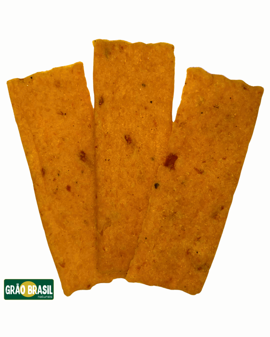 Ingredientes: Cenoura cozida, polvilho azedo, óleo de girassol, fécula de batata, farinha de arroz, azeite de oliva, sal light e tempero orange pepper sem glutamato.